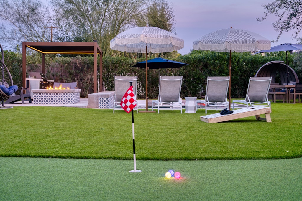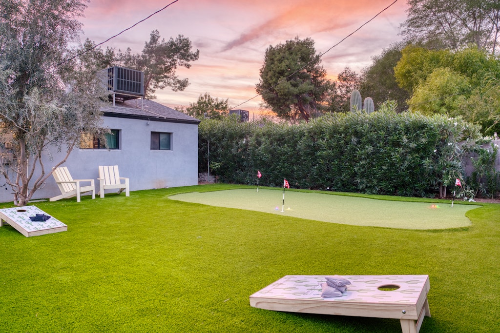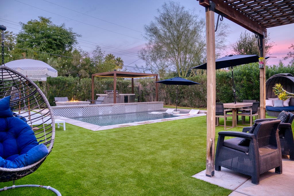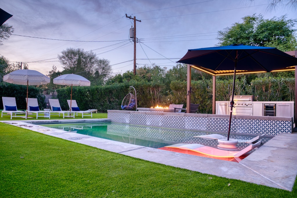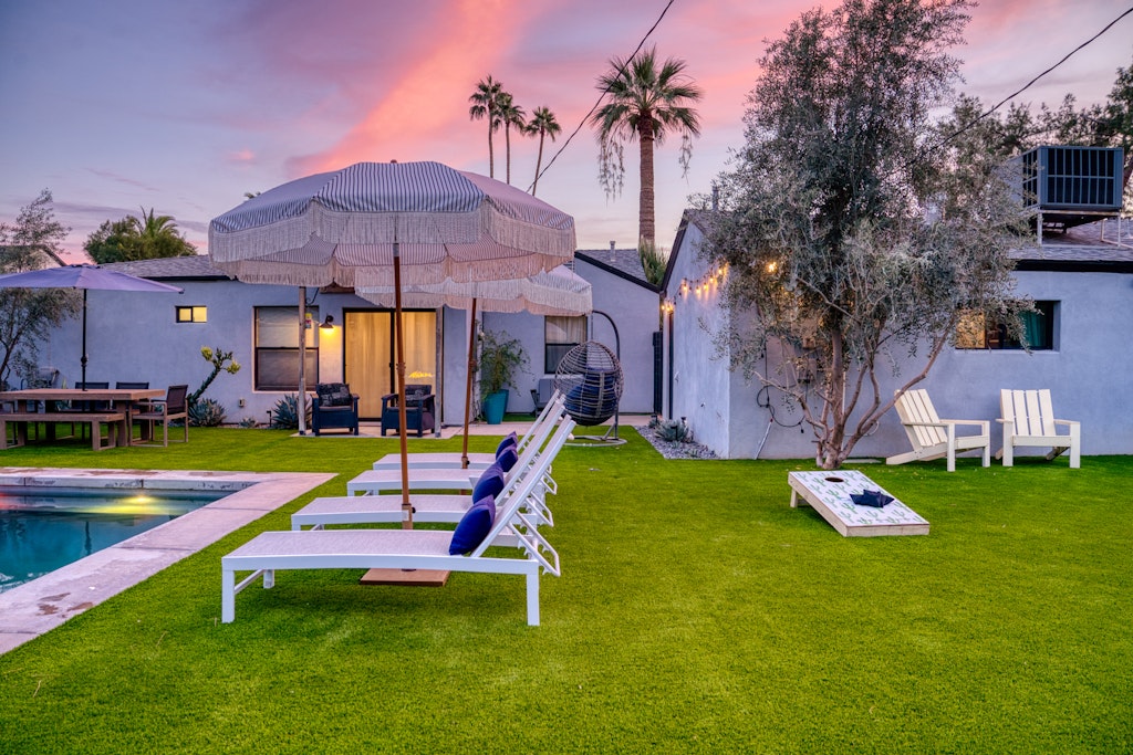 This oasis is perfect for a girlfriends getaway or a family vacation. The well-appointed kitchen in the main house is like no other vacation rental you've stayed in--items like an air fryer, kids dishes. The "kids" room features a full bed with a twin trundle as well as some kids toys and lots of board/card games for kids and adults alike! We also have outdoor games like cornhole and bocce ball. The large dining table and large island seat large families comfortably. We also have a pack and play for our guests to use during their stay. Black framed windows and black hardware throughout, beautiful industrial lighting with filament bulbs, modern wood tile, mint-colored kitchen cabinets in the main house with opal marble countertops, industrial farmhouse design with industrial elements. Featuring high speed wi-fi, cable and smart flat screen TV's in all the rooms. In the casita we have an open kitchen/living space features dining area, couch that folds down to additional full-size bed, a large flat screen smart tv equipped with Disney+, Netflix, Hulu, and ESPN+ along with high speed Wifi. Black framed windows and black hardware throughout, beautiful industrial lighting with filament bulbs, modern wood tile floor, white cabinets with beautiful grey quartz countertops, industrial farmhouse design with industrial elements.