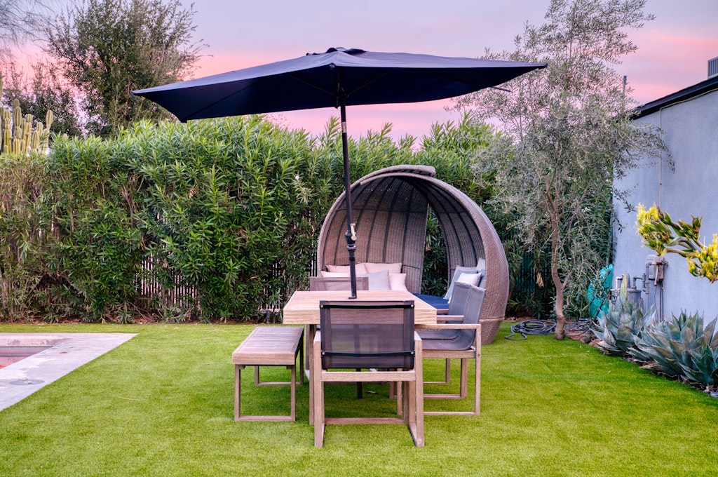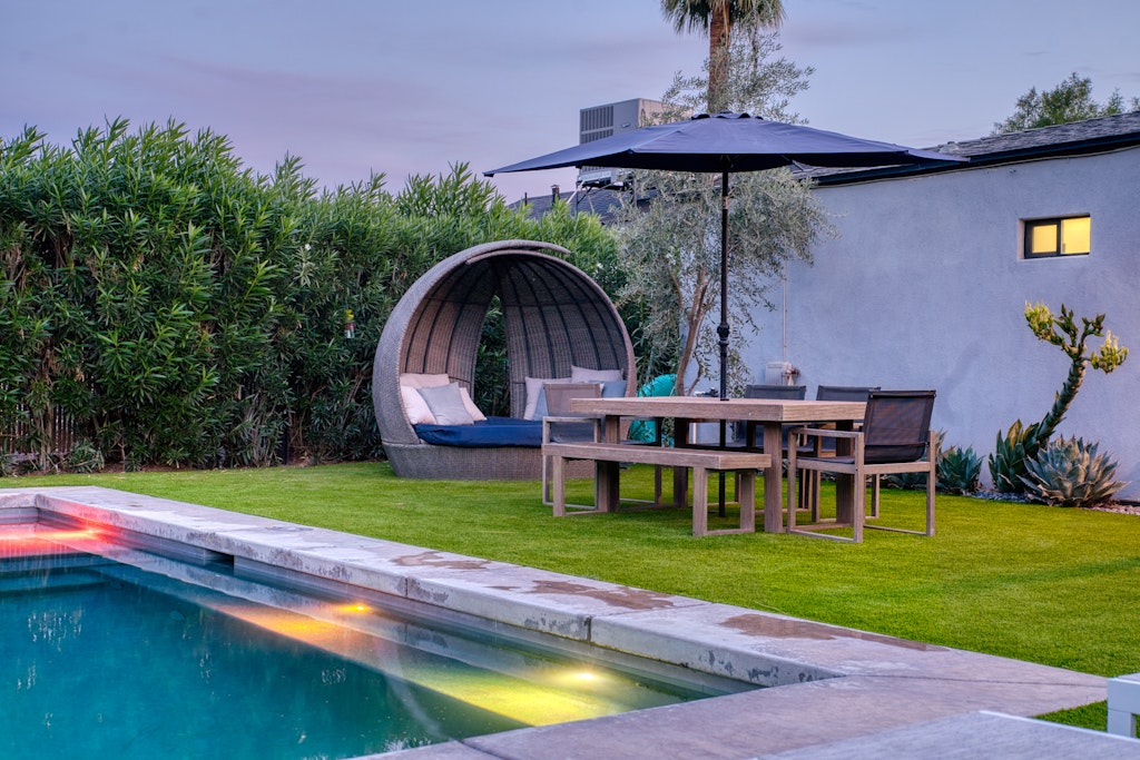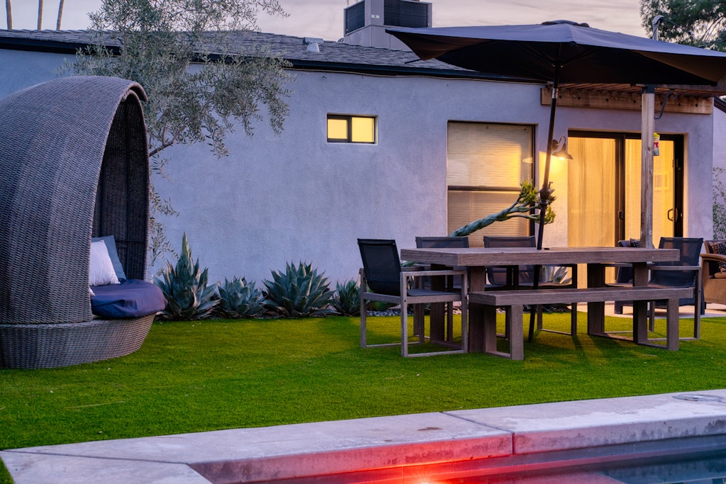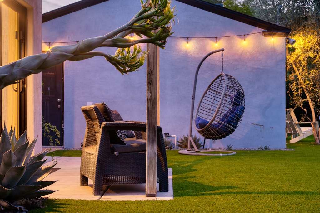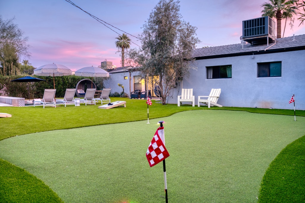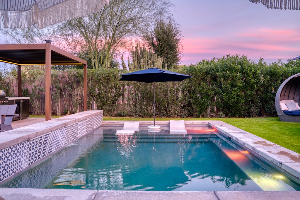 This oasis is perfect for a girlfriends getaway or a family vacation. The well-appointed kitchen in the main house is like no other vacation rental you've stayed in--items like an air fryer, kids dishes. The "kids" room features a full bed with a twin trundle as well as some kids toys and lots of board/card games for kids and adults alike! We also have outdoor games like cornhole and bocce ball. The large dining table and large island seat large families comfortably. We also have a pack and play for our guests to use during their stay. Black framed windows and black hardware throughout, beautiful industrial lighting with filament bulbs, modern wood tile, mint-colored kitchen cabinets in the main house with opal marble countertops, industrial farmhouse design with industrial elements. Featuring high speed wi-fi, cable and smart flat screen TV's in all the rooms. In the casita we have an open kitchen/living space features dining area, couch that folds down to additional full-size bed, a large flat screen smart tv equipped with Disney+, Netflix, Hulu, and ESPN+ along with high speed Wifi. Black framed windows and black hardware throughout, beautiful industrial lighting with filament bulbs, modern wood tile floor, white cabinets with beautiful grey quartz countertops, industrial farmhouse design with industrial elements.