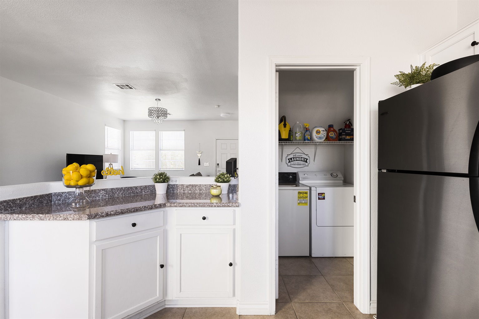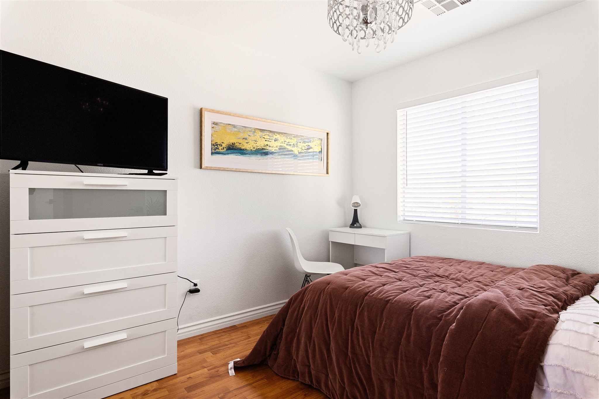 Beautifully furnished with upscale art, the living room and dining area/breakfast bar have comfy seating, and a large, flat-screen TV. The bedrooms feature high-end linens, down pillows, and great recessed lighting with dimmers throughout. Iphone/Ipod speakers/alarm clock in master bedroom. The garage has been converted into living space but don't worry, the driveway only sees about 4 hours of sunlight per day.