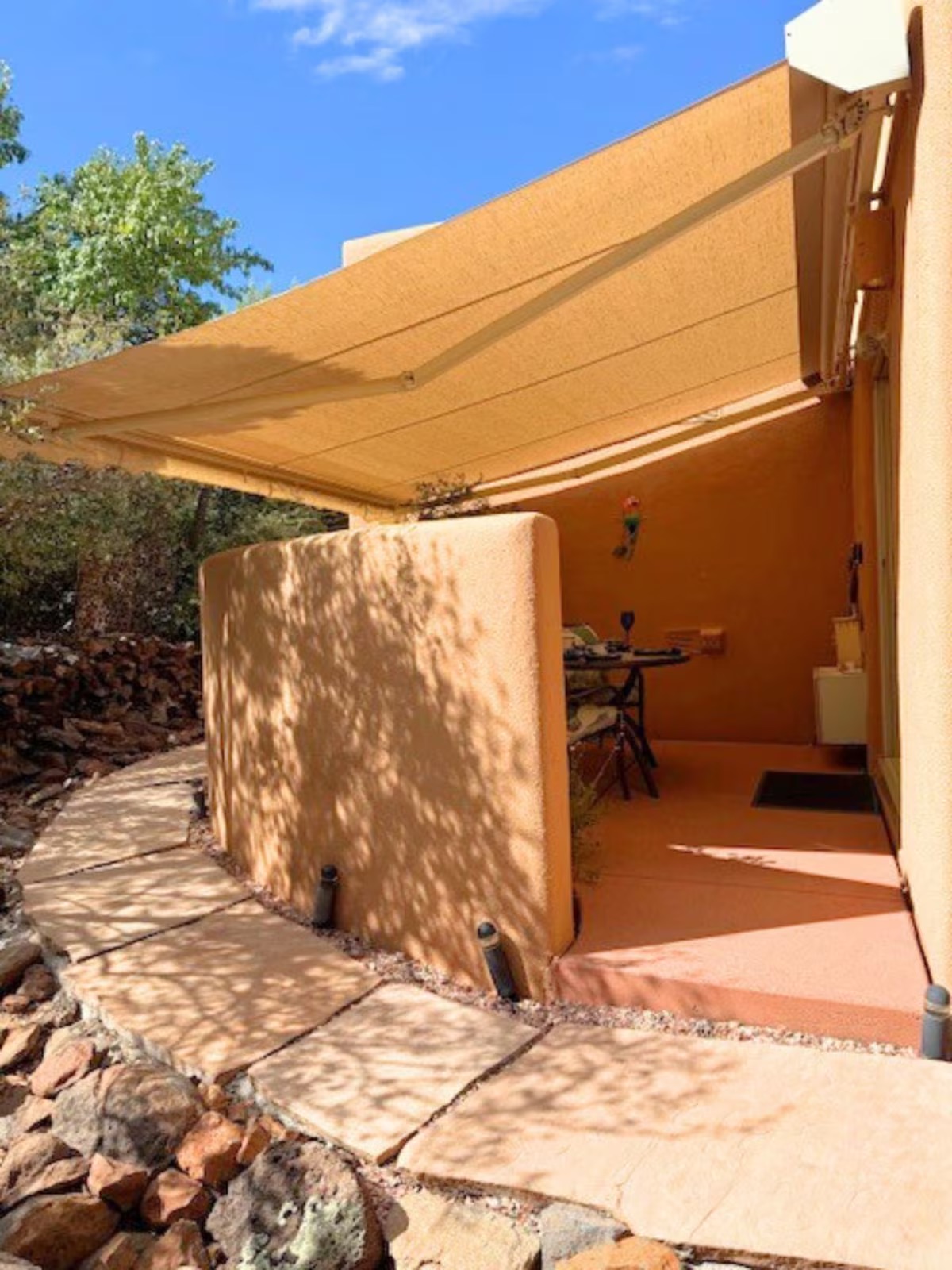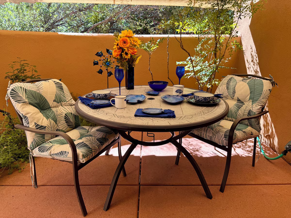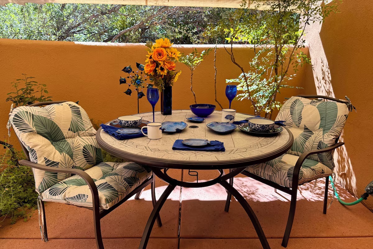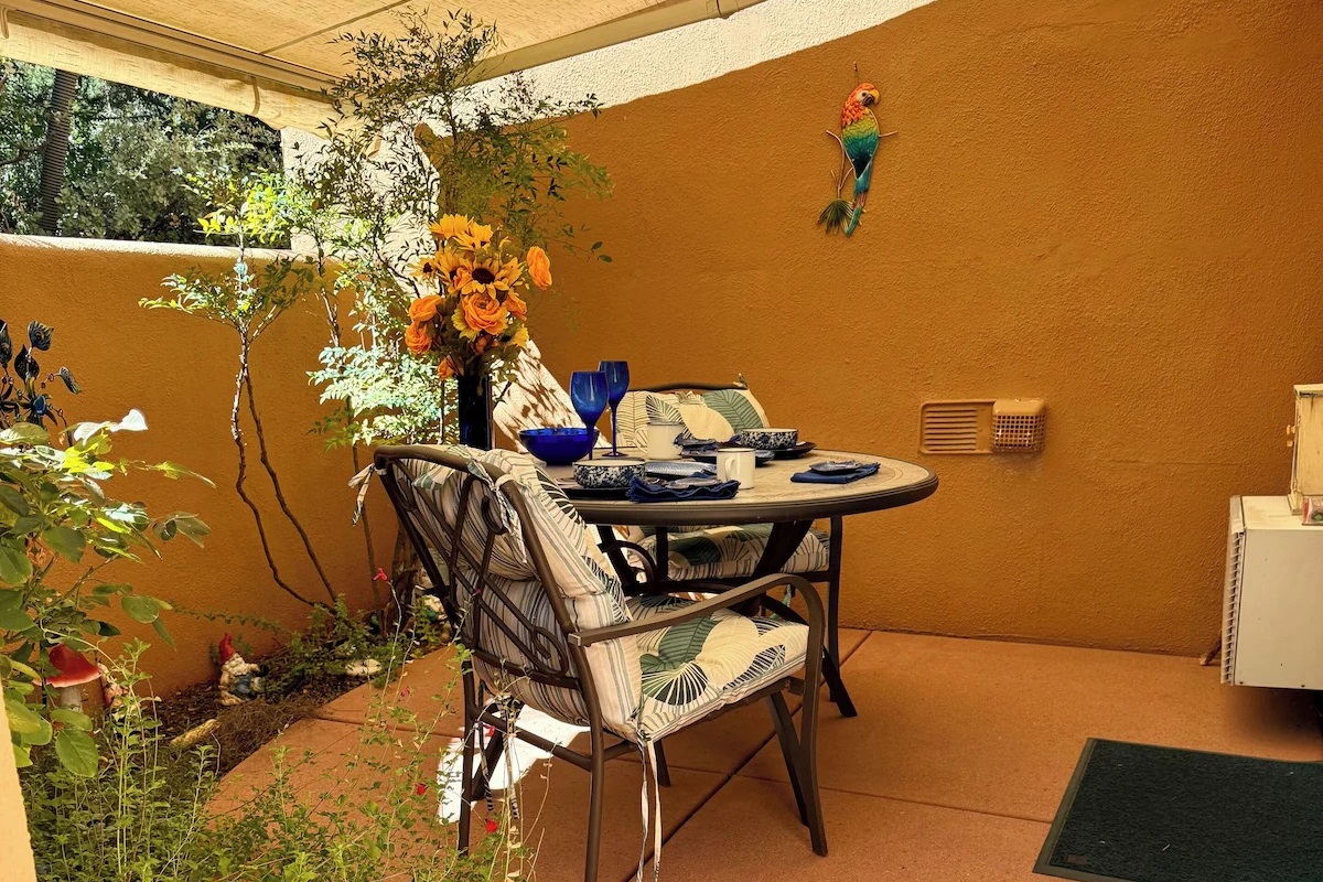 Step into your secluded garden patio — an outdoor room designed for relaxation and connection. Surrounded by juniper trees, fruit trees, and desert flora, the space features: