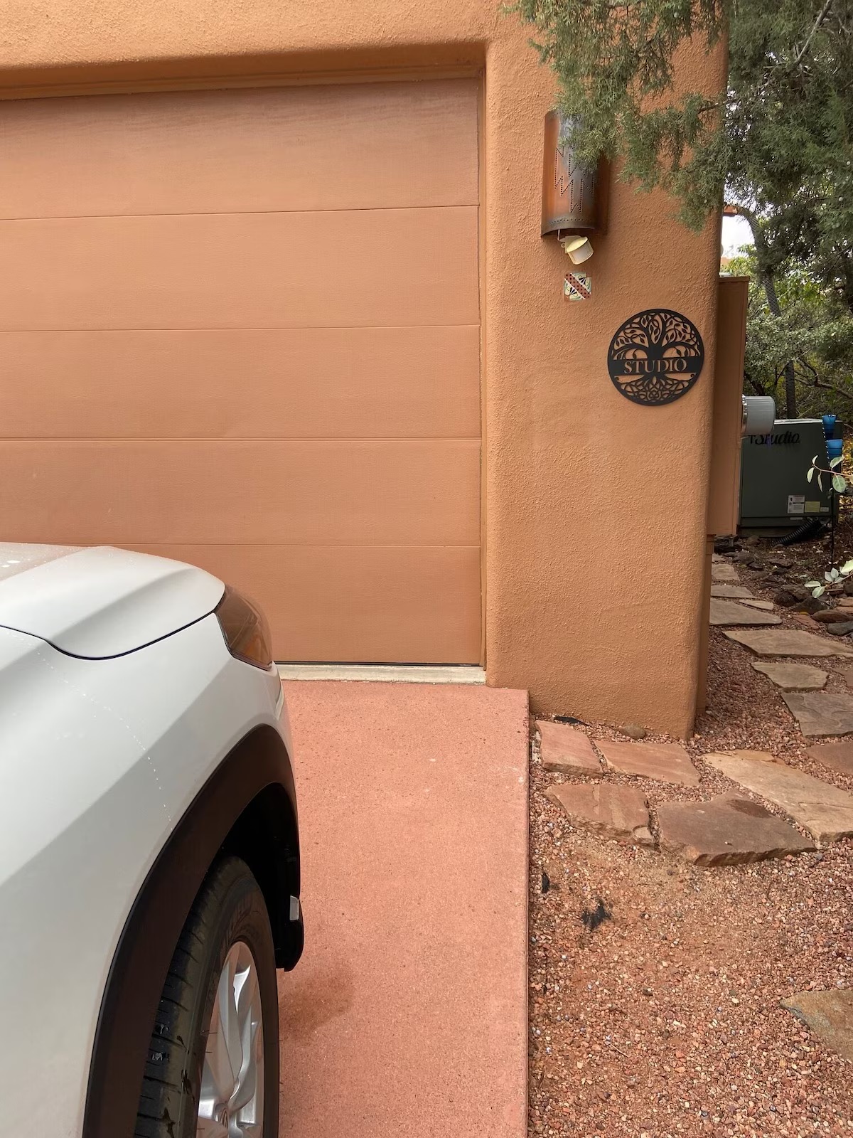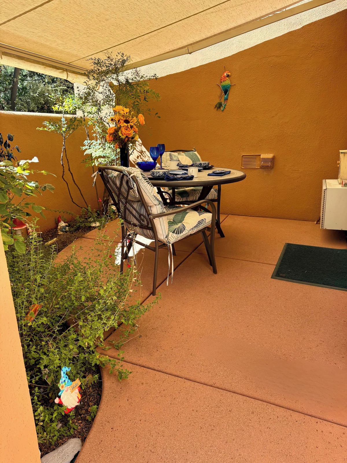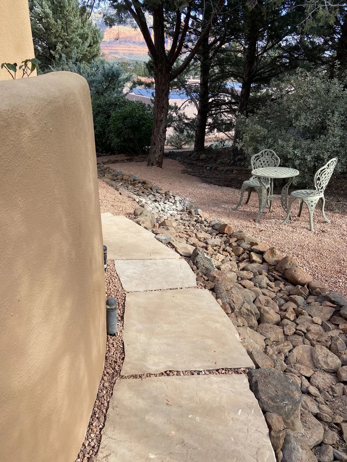 Step into your secluded garden patio — an outdoor room designed for relaxation and connection. Surrounded by juniper trees, fruit trees, and desert flora, the space features: