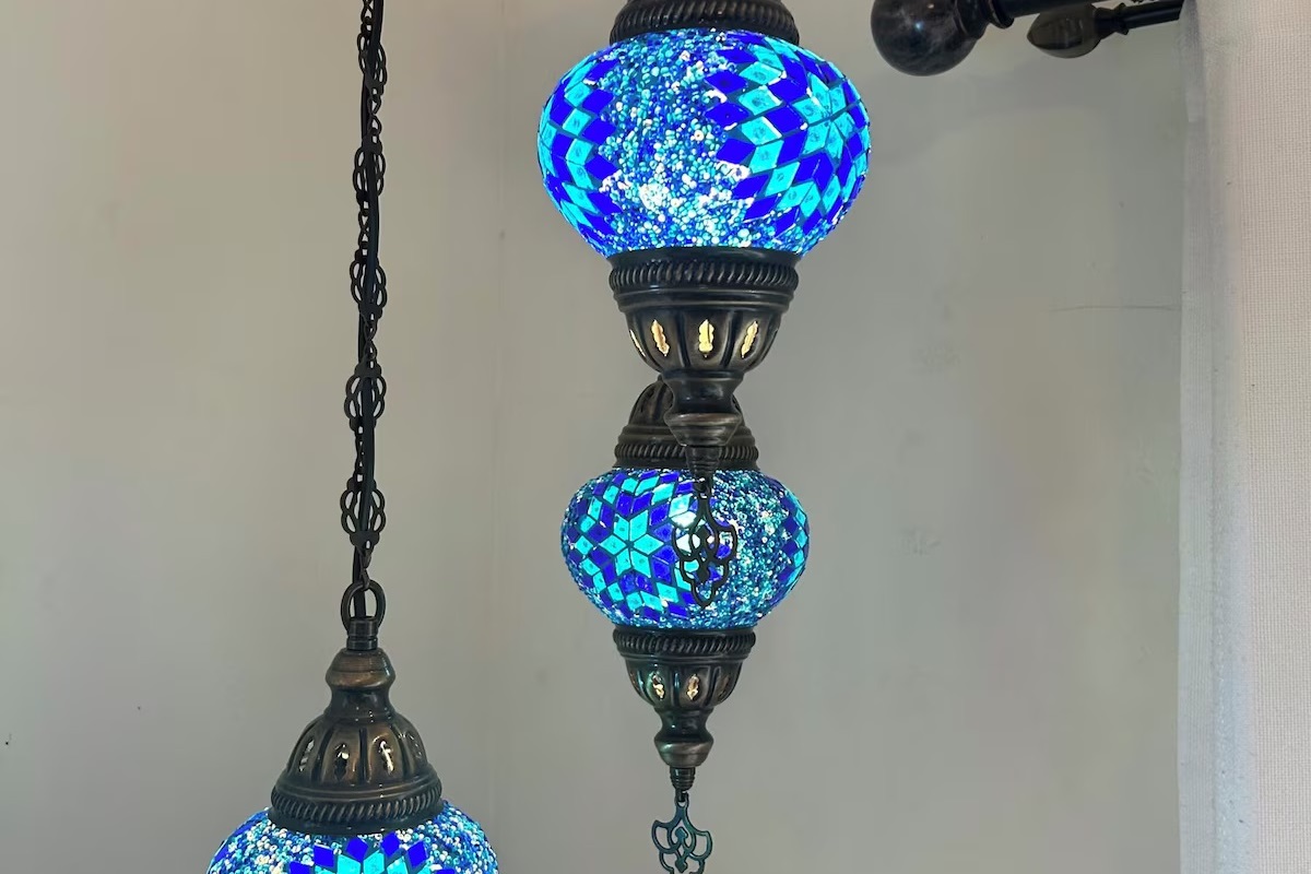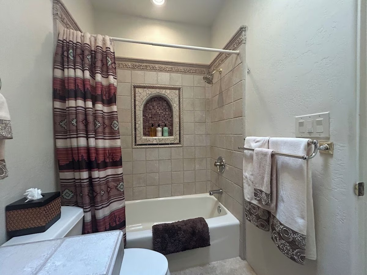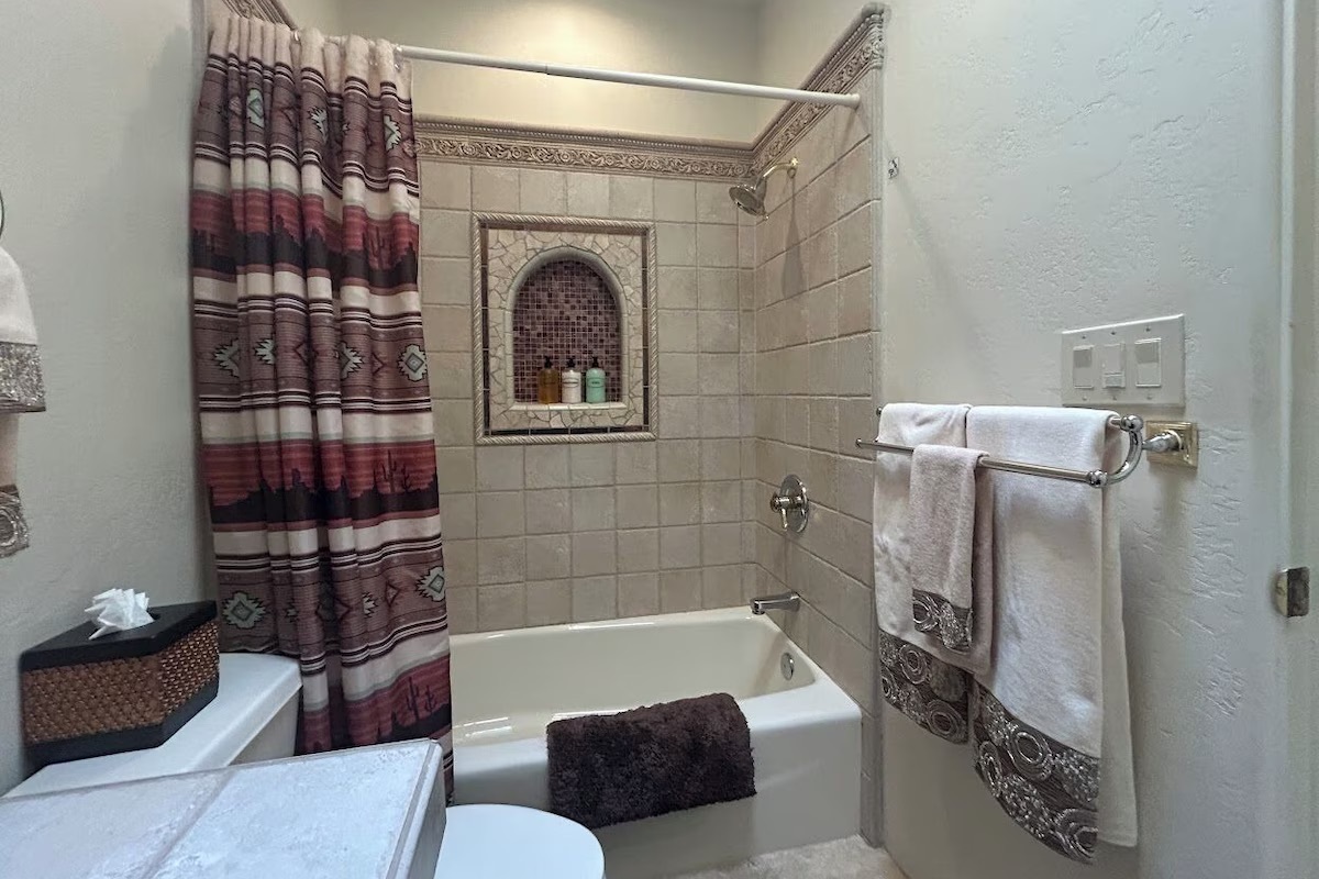 - Italian-tiled bathroom with custom mosaic detail by the artist-owner