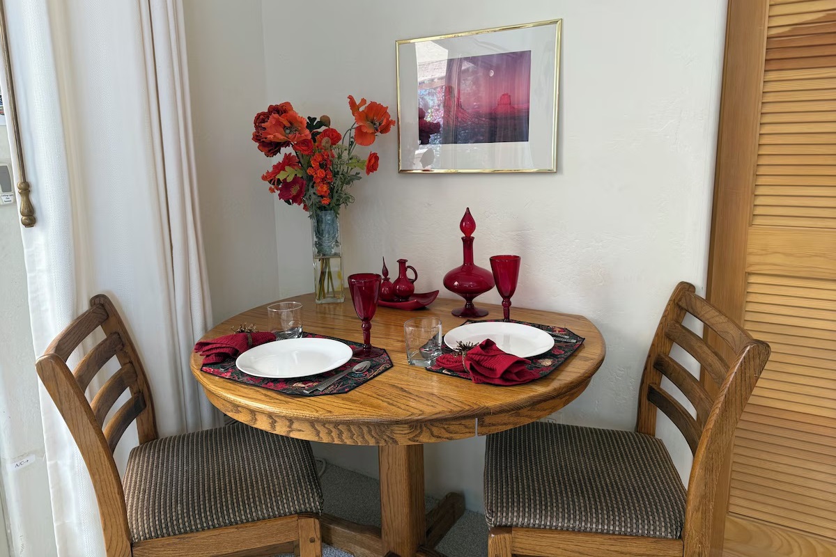 This light-filled studio blends comfort and craftsmanship with understated luxury. High ceilings and expansive windows frame the iconic Red Rocks, creating a seamless connection between indoor elegance and Sedona’s natural majesty.